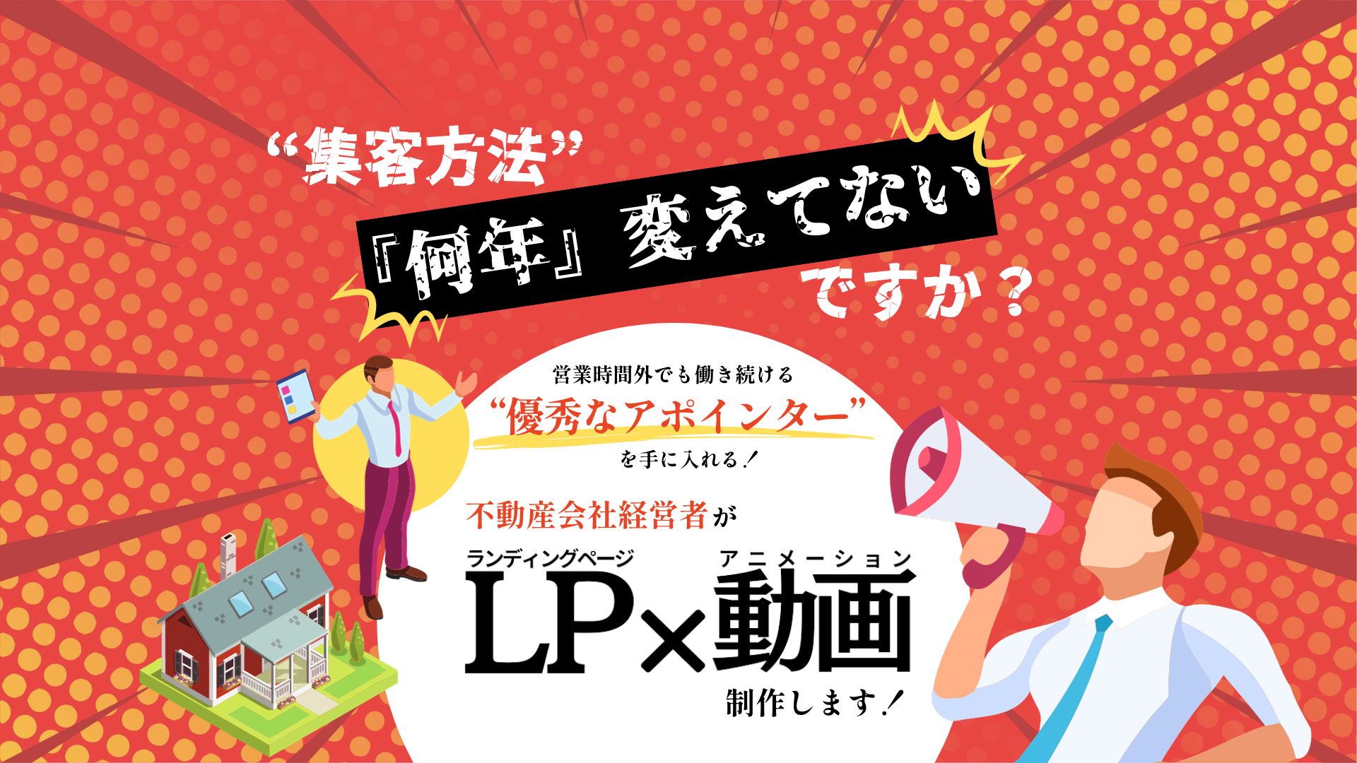 多くの広告代理店は分業制です。ヒアリングをする人、構成を考える人、文章を考える人、デザインをつくる人、コーディングをする人など、数多くの制作をこなす上で必要な分業ですが、この方達のどのくらいが営業経験者なのでしょうか。その文章は、多くの問い合わせ(コンバージョン)を生むかもしれません。『問い合わせを成約に繋げられないのは御社側の営業力の問題ではないか』と言われるかもしれません。しかし、成約に繋がるランディングページとは、どのような商談(クロージング)をしたいのかを踏まえて制作されるものであると考えています。テンプレートに則った構成、文章、デザインは必要ありません。必要なのは、優秀な営業マンのようなランディングページです。ヒアリング、構成、文章、デザイン、動画制作を、不動産業界にて営業経験のある私が全てを行います。